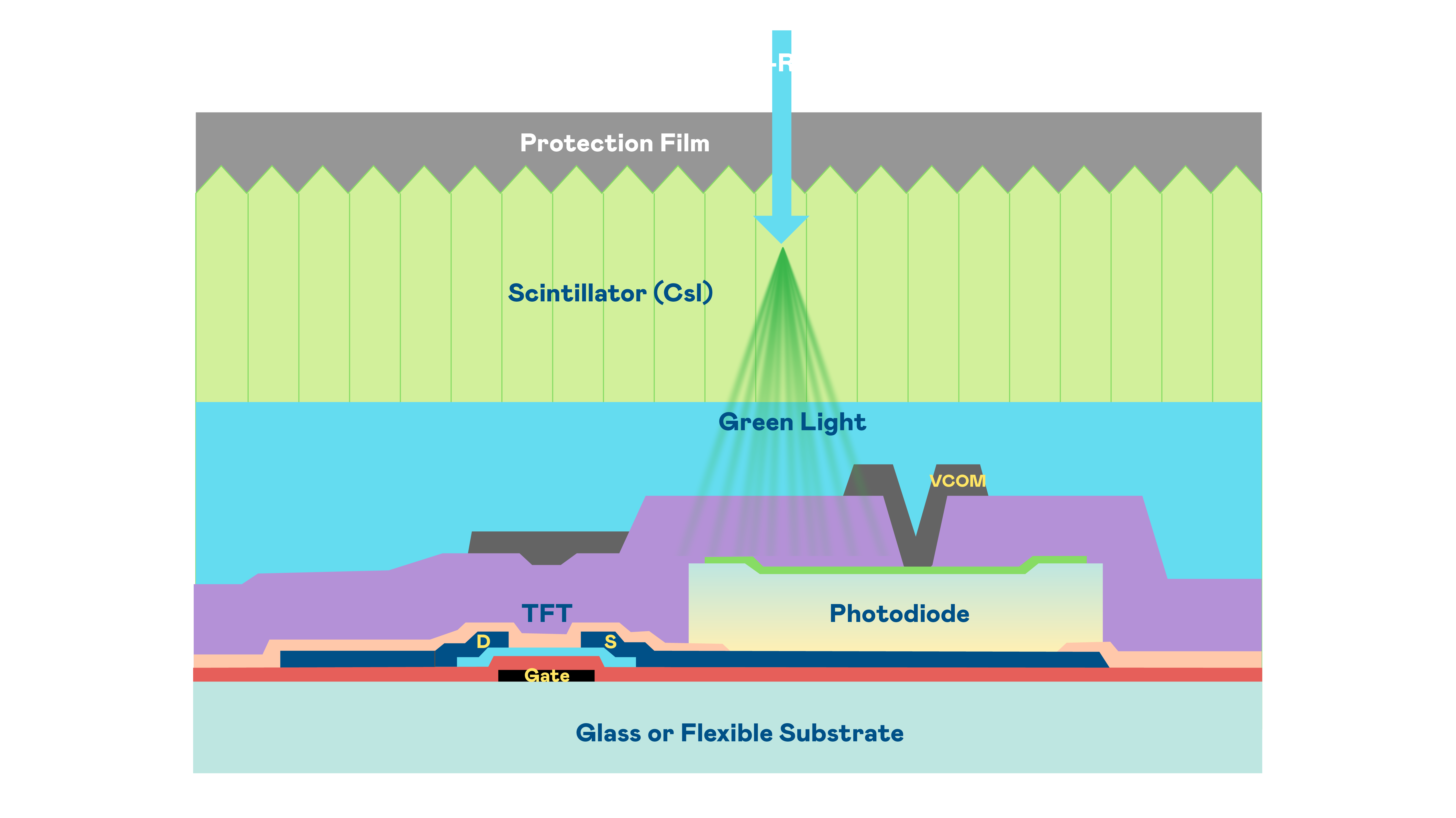 永利娱乐城的X光影像感测阵列使用薄膜电晶体 (TFT) 作为每个像素的读取开关,搭配光电二极体(Photodiode)的光电转换元件,用以感测X光影像讯号。